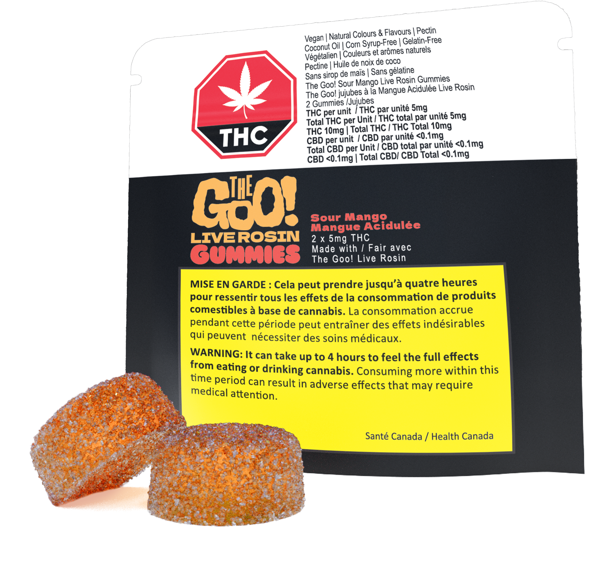 Made with 100% solventless The Goo! live rosin, craft-made by Crop Circle Cannabis. Premium ingredients, including natural flavours and colours, pectin, and coconut oil. Juicy Mango flavour with a sour kick. No gelatin. No corn syrup. Vegan. Gluten-free. Two 5mg units per compact pouch.